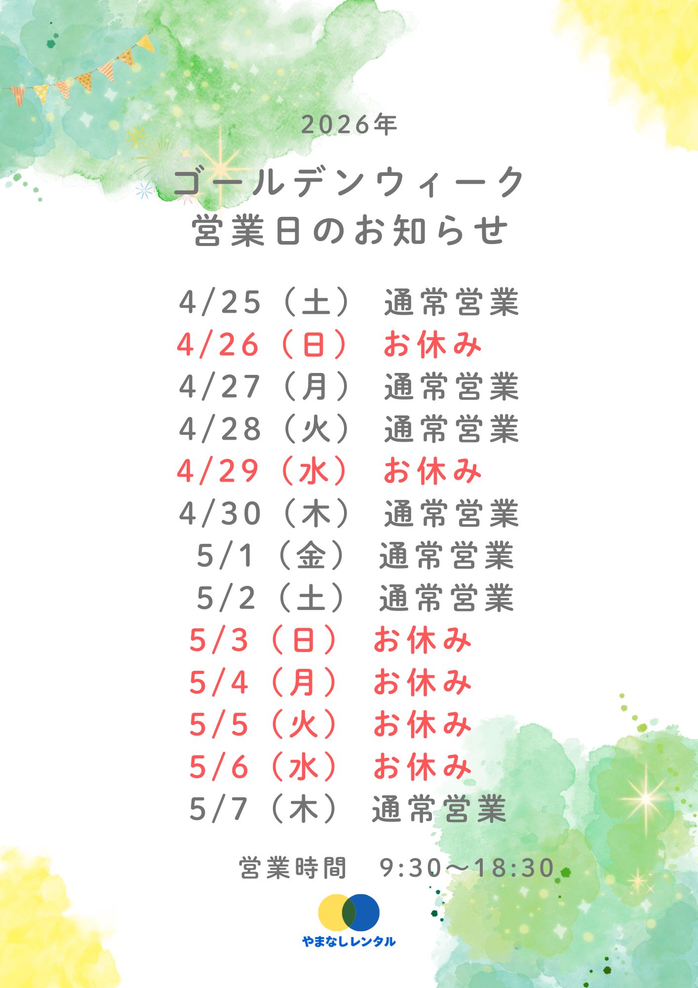 2026年GWの営業についてのおしらせ 日頃よりご愛顧いただき、誠にありがとうございます。 誠に勝手ながら、下記の期間を休業とさせていただきます。 【店休日】 2026年4月29日(水)、5月3日(日)~ 5月6(水) 休業期間中にいただいたお問い合わせ・ご注文につきましては、5月7日(木)以降、順次対応させていただきます。 また、5月23日(土)も休業日とさせていただきます。 ご不便をおかけいたしますが、何卒ご理解のほどよろしくお願い申し上げます。