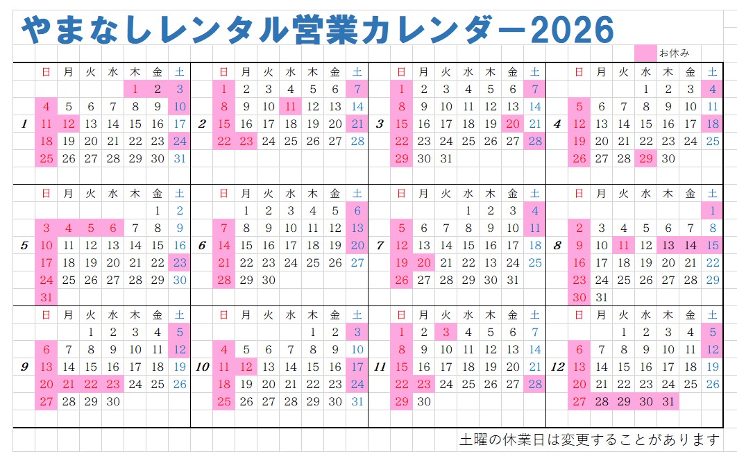 2026年の年間営業カレンダー 本年より変則的に土曜も店休日を設けております。今頃ではありますが年間カレンダーを載せます。 年間予定となりますので、変更する可能性もございます。変更の際はお知らせにて報告致します。 ご不便おかけしますが、よろしくお願いします。